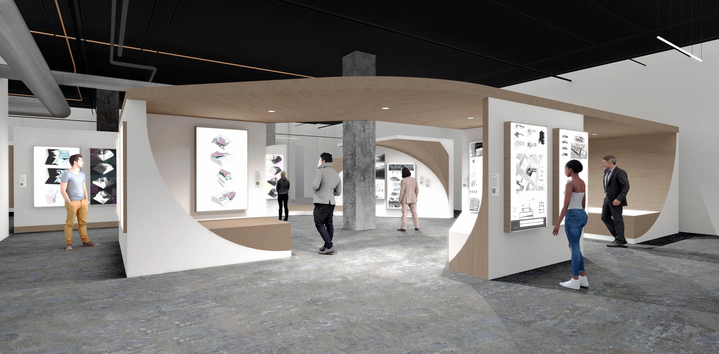 The overall organizational strategy is layered into 4 distinct zones, entry, walk-over exhibit, walk-under exhibit and arrival. The exhibit structure consists of 9 total ‘pods’, 6 voided, that are attached by a flat floor or ceiling element, and 3 floating solids. The orientation of the design counters a traditional gallery box by offering oblique view angles of the work and non-frontal approaches; a wondering discovery of the works hidden around bends and niches. The design is flexible up to 40 student projects or less, by choosing which walls receive the 2x8 branding after student submissions are completed. Painted white or left as natural birch plywood allows either projects or graphics to be displayed. The exhibition is domestic spatially, in scale and in material. AR and model platforms in front of the boards or for larger models, lower areas of raised steps accompany the inner areas of the ceiling and floor elements. The project displays are back-lit within wall-offset boxes or flush-to-wall inset boxes, depending on the use of a skate ramps for hanging, and if the structure can be blocked out. Additional lighting is provided within the overhead ceilings element and soffits of individual pods, allowing the flat floor or ceiling elements to conceal electrical wires.